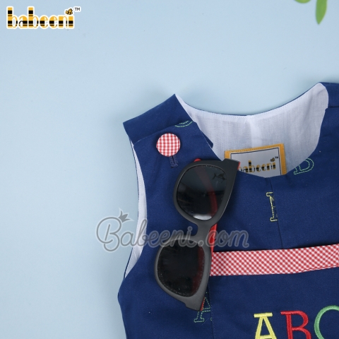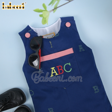 Feature: Cute Shortall for boy with a pocket ahead which is with embroidered letters ABC. Snap buttons on the shoulder.Easy to mix with a shirt or T-shirt.