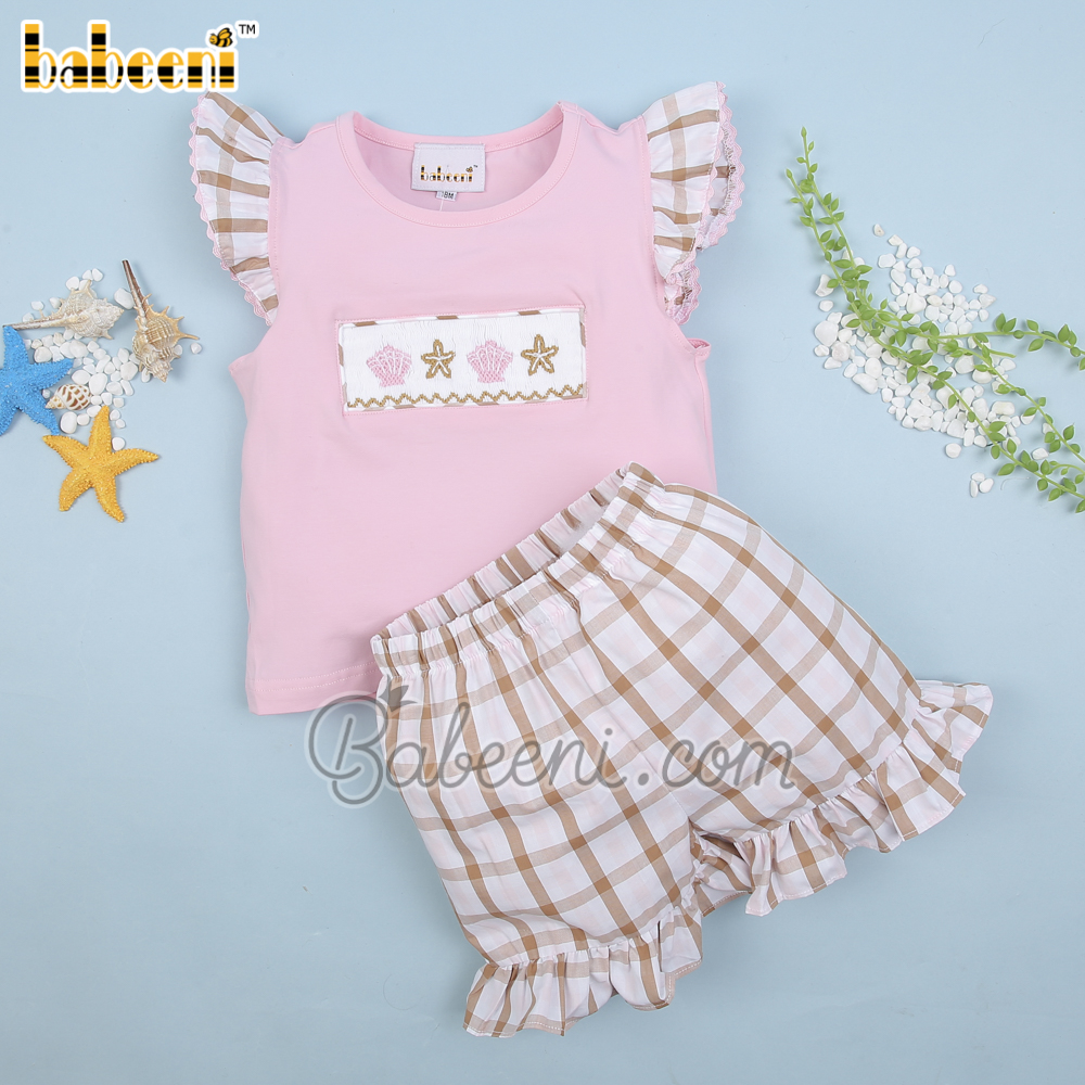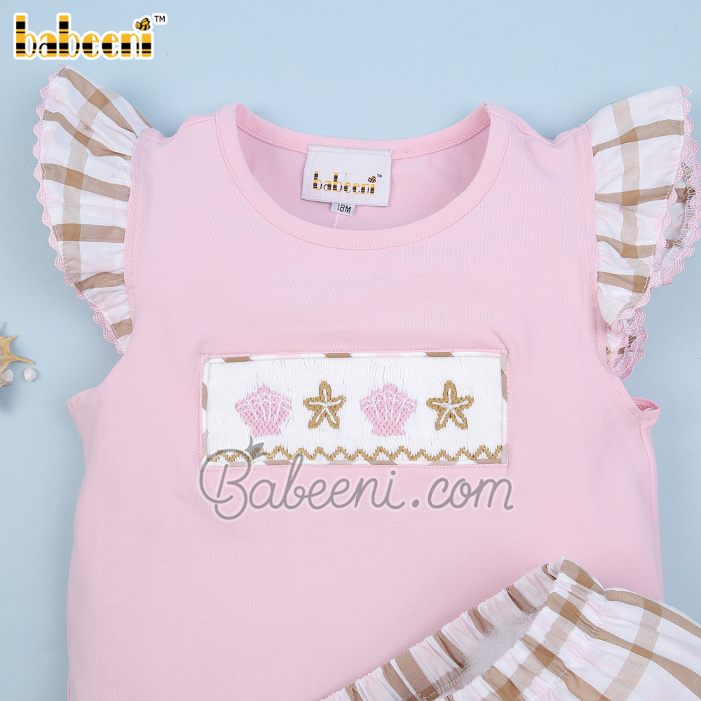 Feature: Cute girl clothing set with sea creature of starfish and seashell hand smocked patterns on the top, angel sleeves, bottom ruffles.