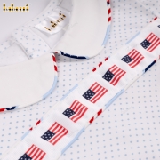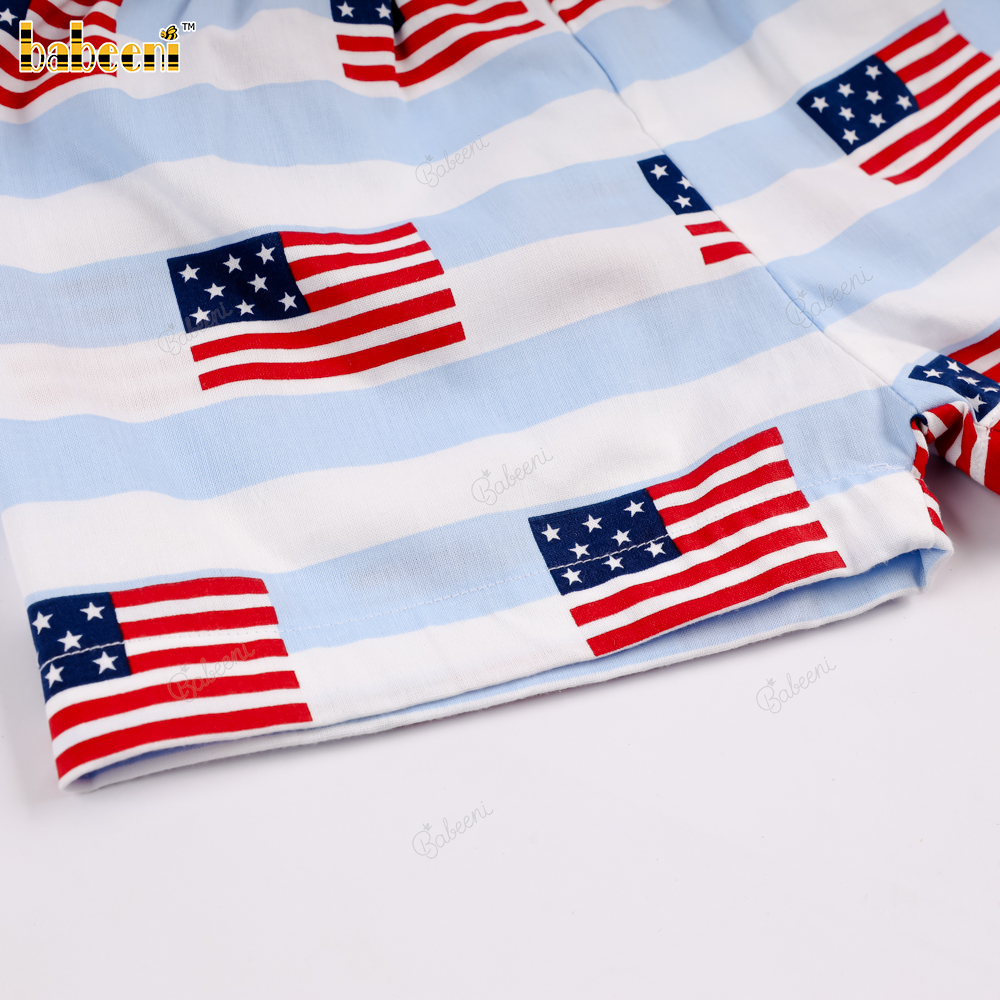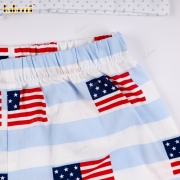 Material: American flag patterned fabric + blue striped pants with American flag print