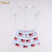 Set includes a crew neck t-shirt and shorts with an American flag print.- BB3578