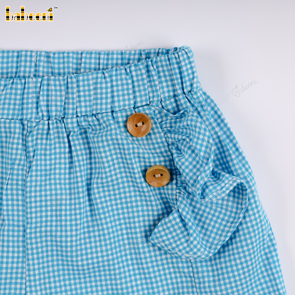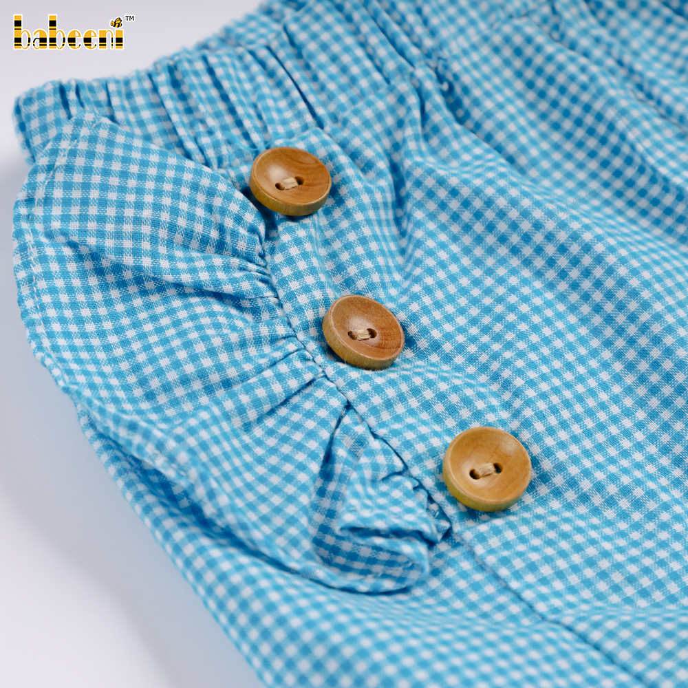 Feature: This summery outfit features a light blue t-shirt with an eye-catching embroidered sailboat design. The sleeves are designed with pretty ruffles, adding a feminine and cute touch. The blue checkered shorts, with delicate wooden buttons on the sides, create a look that is both energetic and elegant. Perfect for outings, walks, or birthday parties.