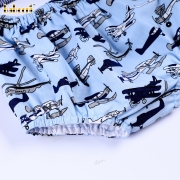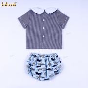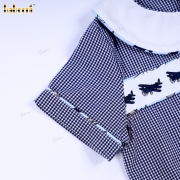 Feature: Two-piece set including a short-sleeve navy gingham shirt and matching bloomer shorts. The top features a crisp white Peter Pan collar and a horizontal panel across the chest adorned with delicate airplane embroidery, adding a refined yet playful aviation theme. The bloomer shorts come with an all-over vintage airplane print and are designed with an elastic waistband and elastic leg openings for a secure, comfortable fit. The gathered leg hems create a soft, puffy silhouette, perfect for little boys to move freely and stay cool during warm days.