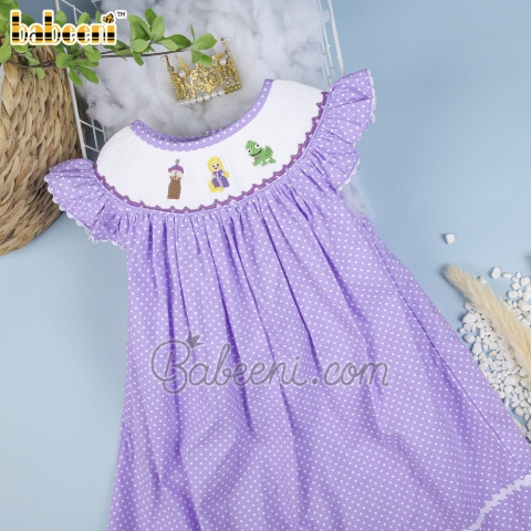 Feature:Beautiful bishop dress for little girl with smocked lighthouse, princess & frog on the chest, angel sleeves, white zigzag on sleeves & hem of dress. It is suitable for summer vacation.