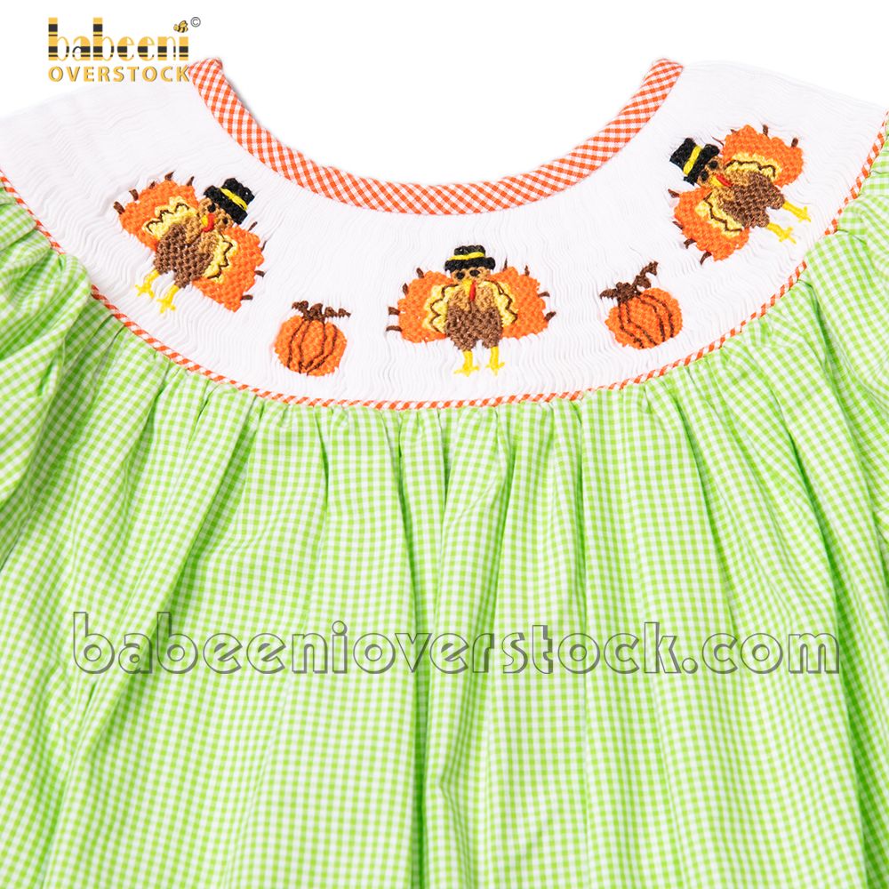 Smocked turkeys Thanksgiving lime gingham girl bubble - BB1999