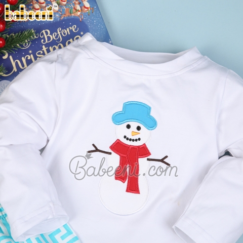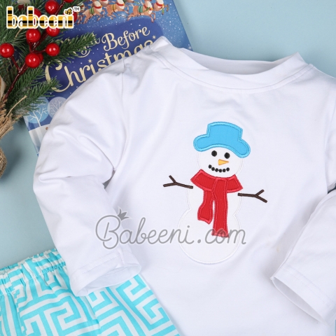 Feature: Lovely Snowman appliqued boy set with Snowman appliqued on the chest, long sleeves.