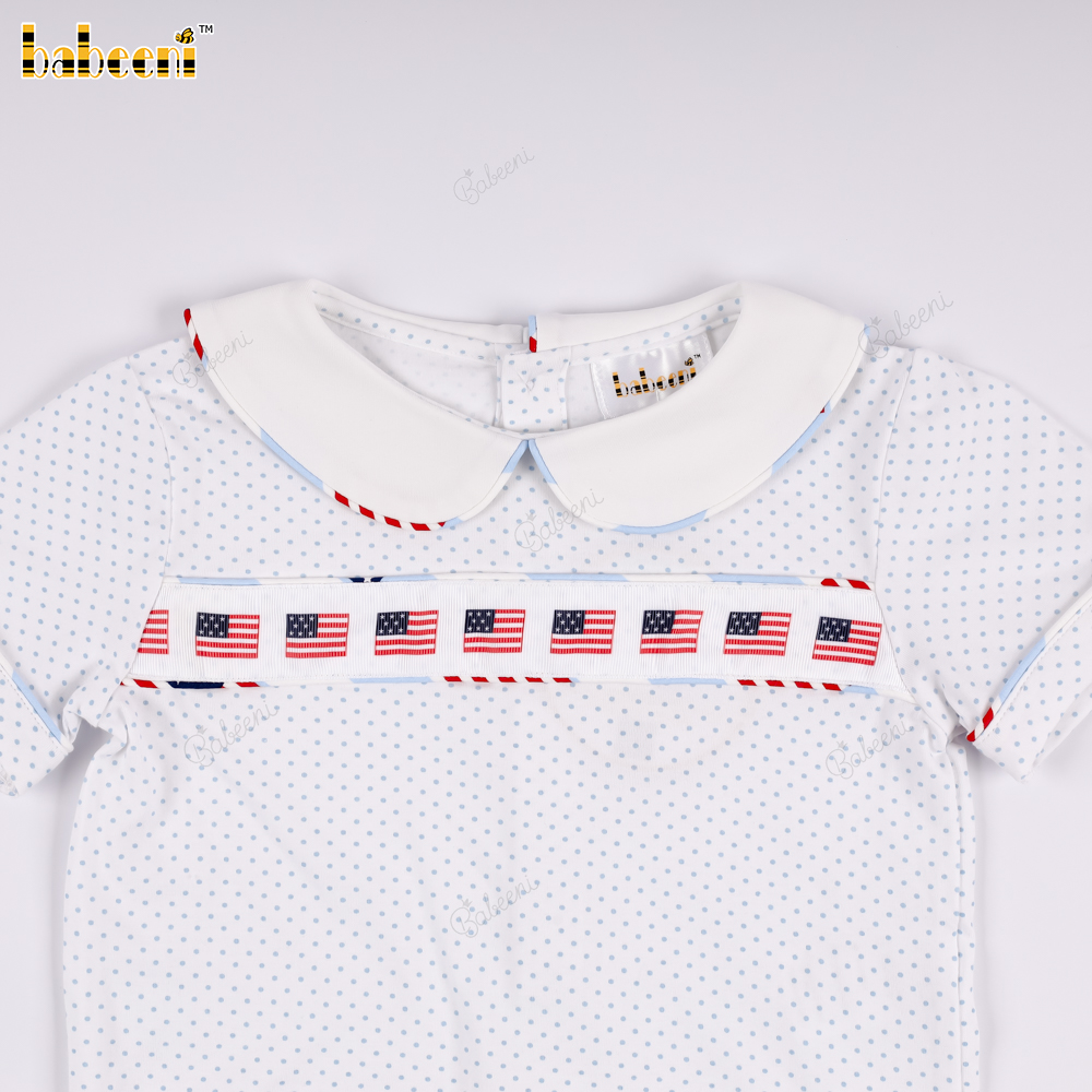 Material: American flag patterned fabric + blue striped pants with American flag print