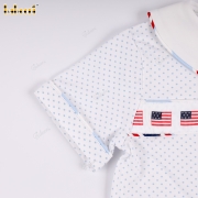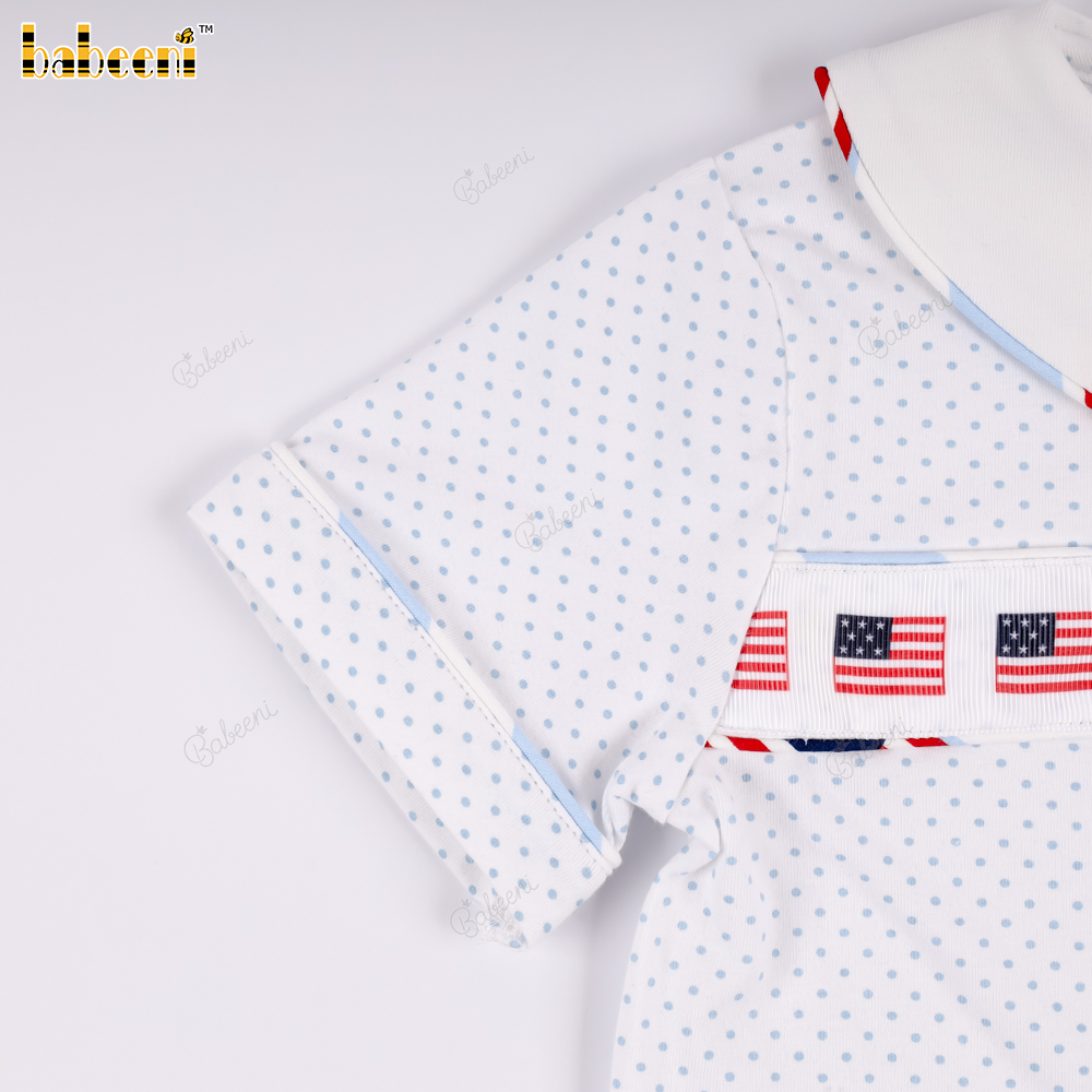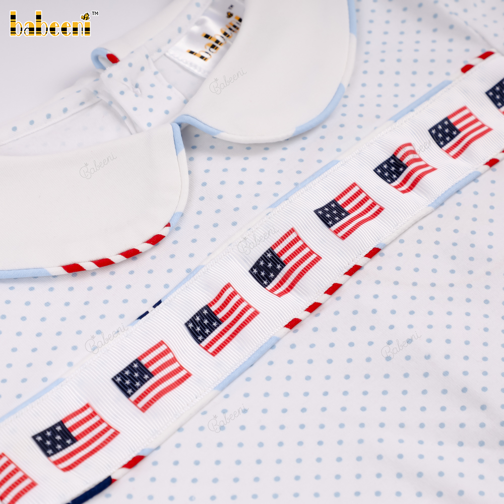 Feature: This girl's outfit exudes a vibrant summer vibe with a white polka-dot t-shirt, accented with a striking American flag striped band at the front and a cute square neckline. The bloomer pants, also featuring an American flag print, are made from soft fabric with a comfortable elastic waistband, creating an overall youthful and adorable look. Perfect for strolls, festivals, or as a wonderful summer gift.