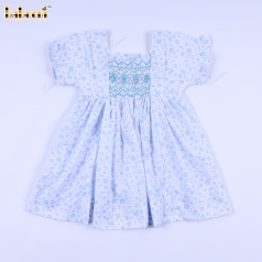 Geometric Smocked Dress Blue Flower On White For Girl - BB3286A