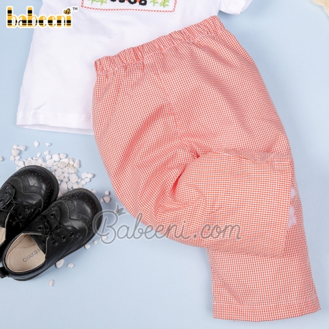 Features: Nice boy clothing for little boys with hand smocked truck of pumpkin & trees on the chest, orange gingham bottom. Perfect for Thanksgiving. Best gifts for birthday or special days.