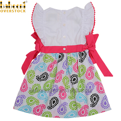 Feature: Beautiful girl dress with paisley pattern embroidered on the top part. Mixed by pique and printed woven fabric. Hips are embellished with hot pink bows.