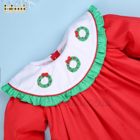 Feature: Pretty dress for little girl on Christmas with wreath hand embroidery patterns on white neck, long sleeves, green ruffles.